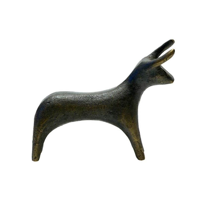 Bull figurine made of patinated brass after model from Bronze age. Find from Solberga, Öland. Length approx. 9 cm.