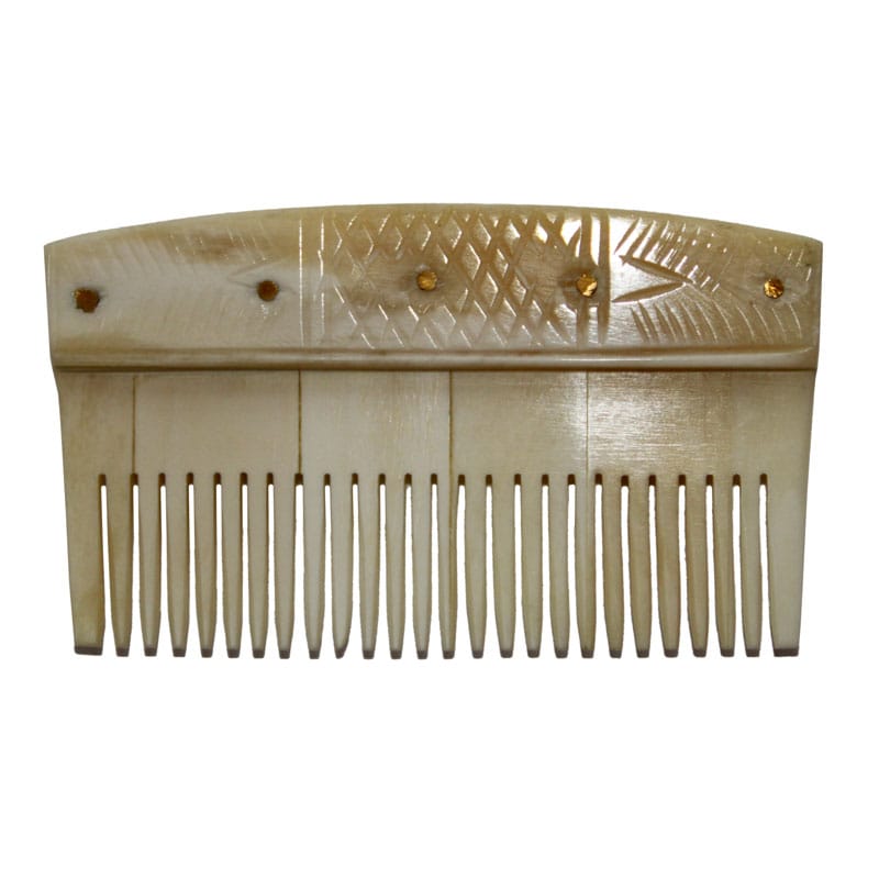 Comb with rivets and carvings, made of bone. Model from Viking age. The comb has en length of approx. 10 cm.