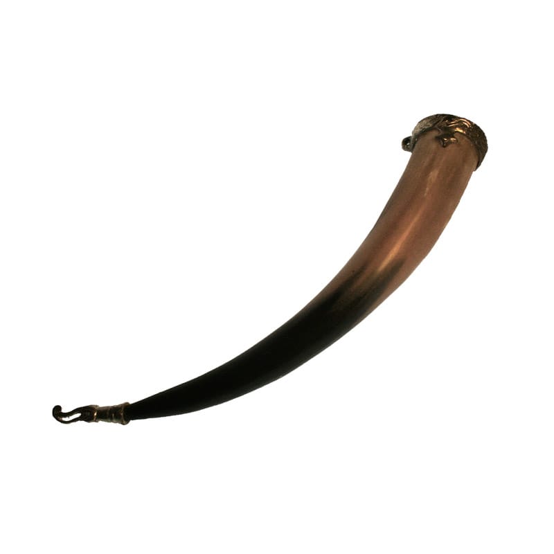 Drinking horn, with metal fitting. The drinking horn has a length of approximately 30-40 cm. The horns are handcrafted from 100% natural horn, which is cleaned, polished, and shaped by hand by skilled artisans, making each horn unique.