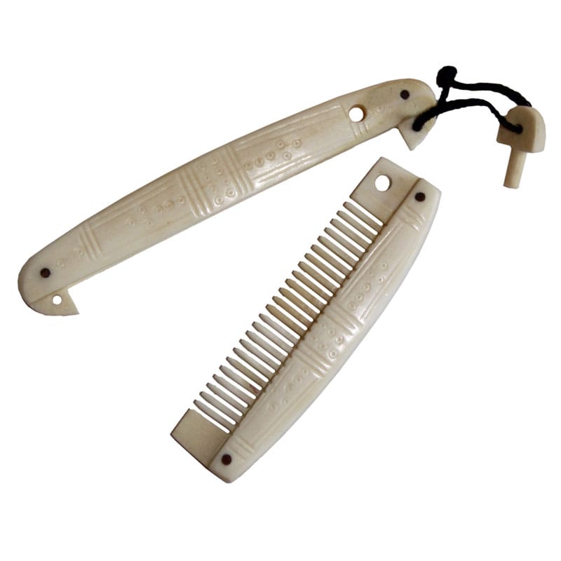 Folding comb with carvings, made of bone. Model from viking age. The comb has en length of approx. 12 cm.