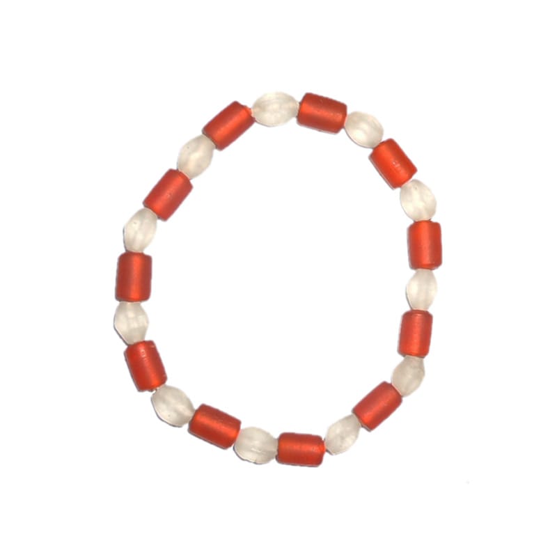 Armband tillverkat av röda och vita glaspärlor efter modell från vikingatiden. Armbandet är elastiskt och har en omkrets på 21 cm.