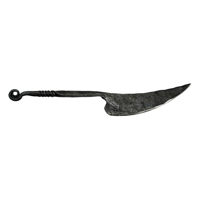 Handsmidd bronsålderskniv tillverkad av stål efter modell från bronsåldern. Kniven har en längd på ungefär 15 cm.