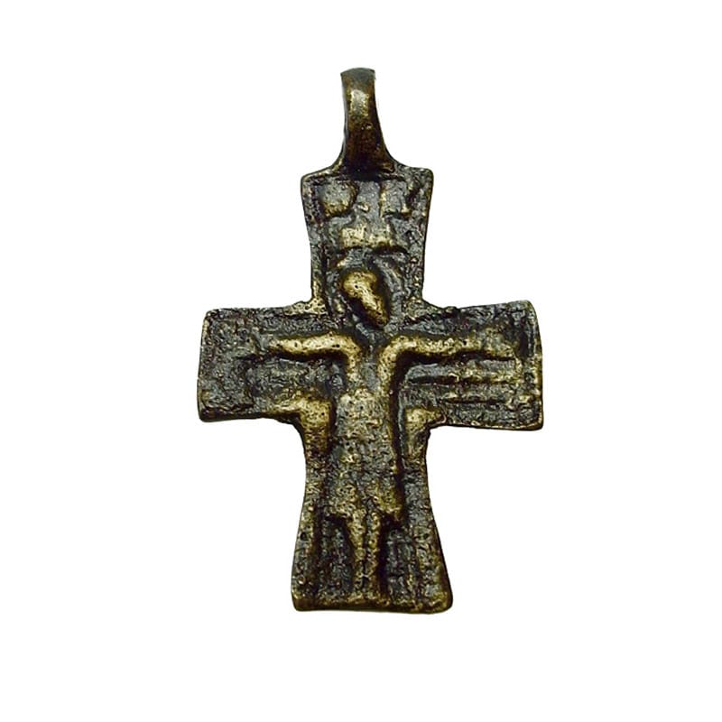 Bysantinskt krucifix av patinerad mässing. Modell från 1100-talet. Hängsmycket har en höjd på ca. 4,5 cm.