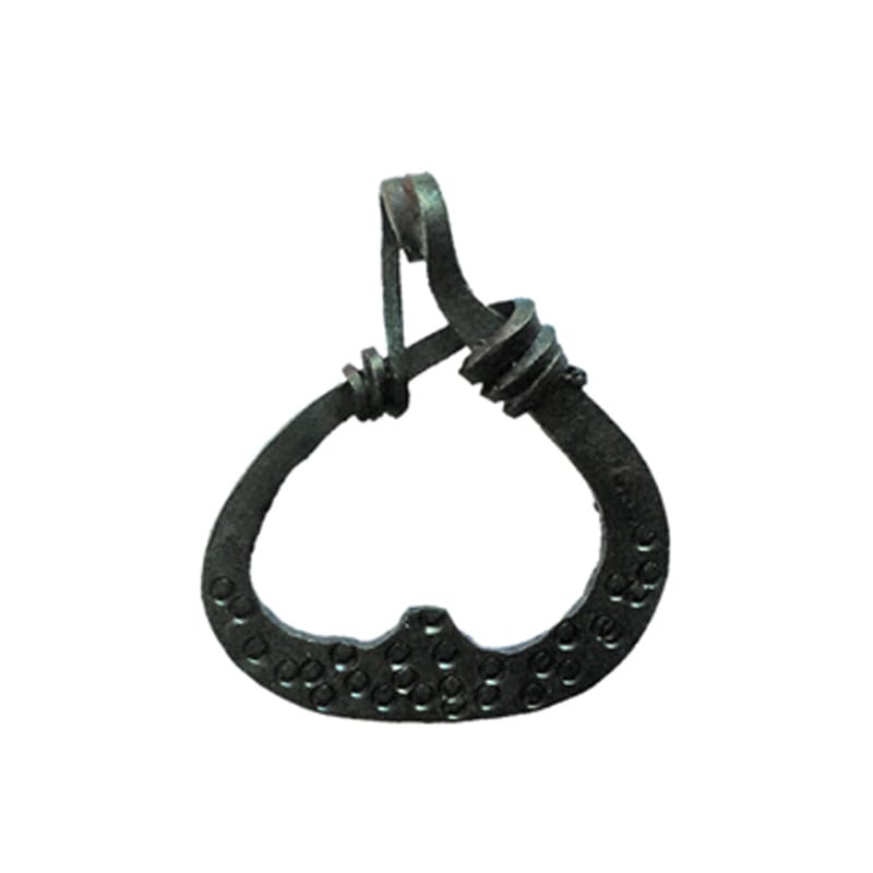 Eldstålssmycke tillverkat av smide/järn. Smycket har en bredd på ca. 5 cm och en höjd på ca. 5,5 cm.