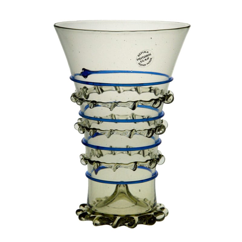 Glas med blå dekor, ca. 14,5 cm. Från slutet av 1200-talet/början av 1300-talet. Okänd tillverkningsort. Tillverkad efter ett original som finns på Museum für Kunsthandwerk, Frankfurt. Då detta glas och liknande har påträffats intakt kan man anta att dessa troligtvis använts som relikglas och därför bevarats. Skärvor av liknande glas har även påträffats på Gotland och i Stockholm.