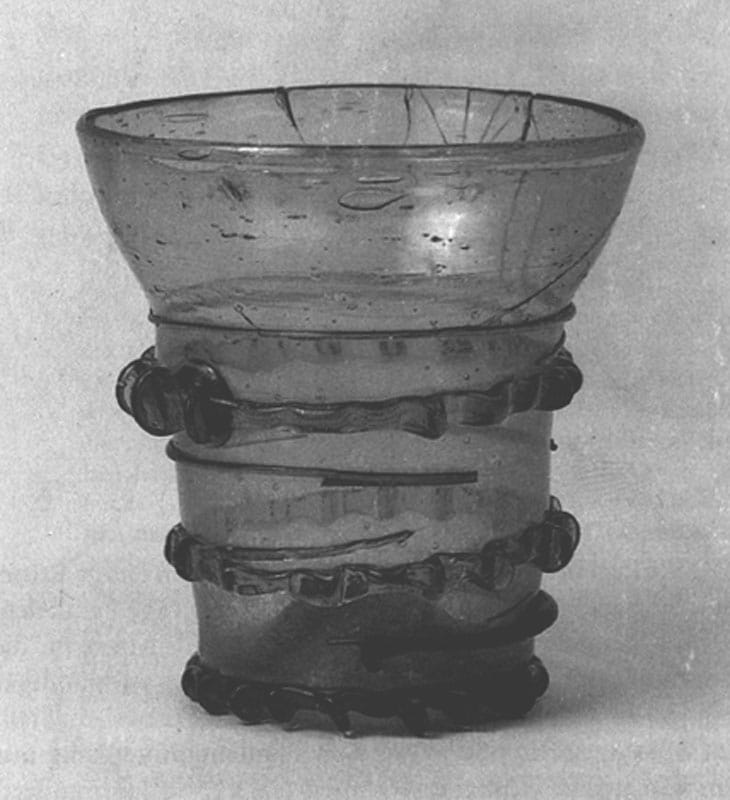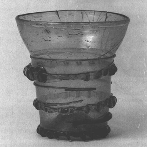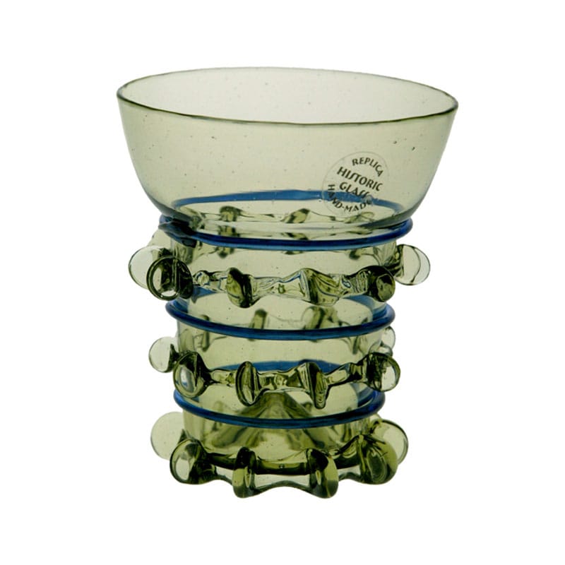 Glas med blå dekor, ca. 8 cm. Från slutet av 1200-talet/början av 1300-talet. Okänd tillverkningsort. Tillverkad efter ett original som finns på Museum für Kunsthandwerk, Frankfurt. Då detta glas och liknande har påträffats intakt kan man anta att dessa troligtvis använts som relikglas och därför bevarats. Skärvor av liknande glas har även påträffats på Gotland och i Stockholm.