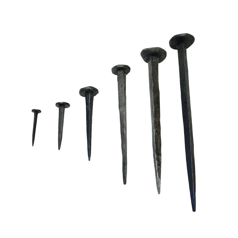 Handsmidda spikar i olika storlekar. Finns i sex olika storlekar. Tillverkade av järn/smide.