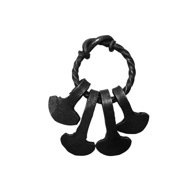 Hänge med fyra torshammare av järn runt en vriden ring. Hänget har en höjd på ca. 6 cm.