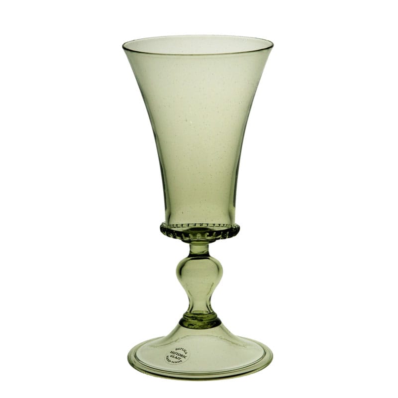 Högt grönt vinglas med blåst ben. Efter modell från Böhmen, 1500-talet. Vinglaset har en volym på ca. 30 cl.