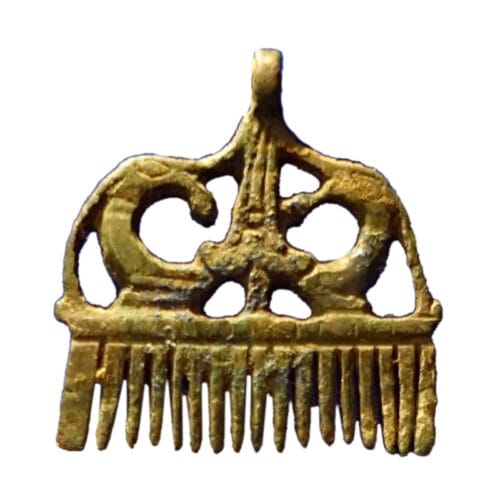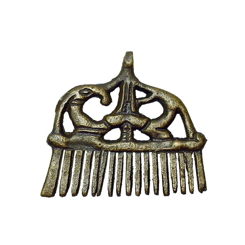 Kam från järnåldern/vikingatiden. Kammen är tillverkad av patinerad mässing och har bredden ca. 60 cm.