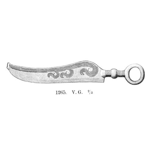 Kniv med ett skaft som slutar med en ring. Har sitt ursprung i Tåstorp, Friggeråkers socken (senare Falköping), bronsålder. Tillverkad av mässing och har en längd på ca. 10 cm.