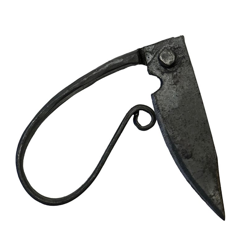 Hopfällbar kvinnokniv tillverkad av järn/smide. Nyare modell från 2000-talet. Kniven har en full längd på ca. 14 cm, och en ihopfälld längd på ca. 7 cm.