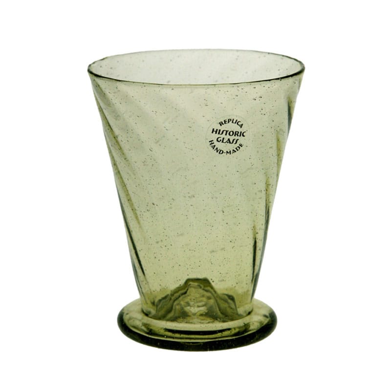 Litet optikblåst grönt glas med en volym på ca. 15 cl. Tillverkad efter modell från Tyskland, 1500-talet.