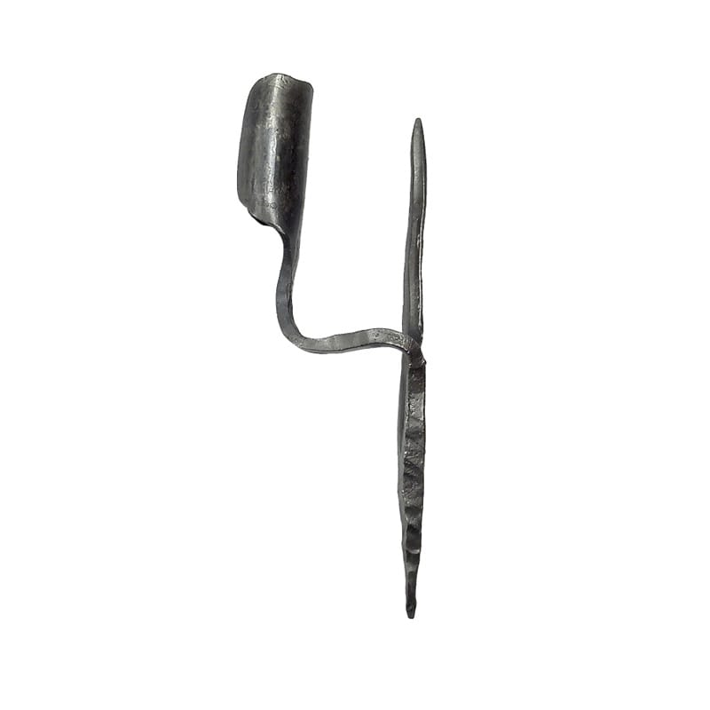 Ljushållare med vinklad och böjd ljusarm, efter modell från Norge och vikingatiden. Ljushållaren har en höjd på ca. 15 cm och är tillverkad av järn.