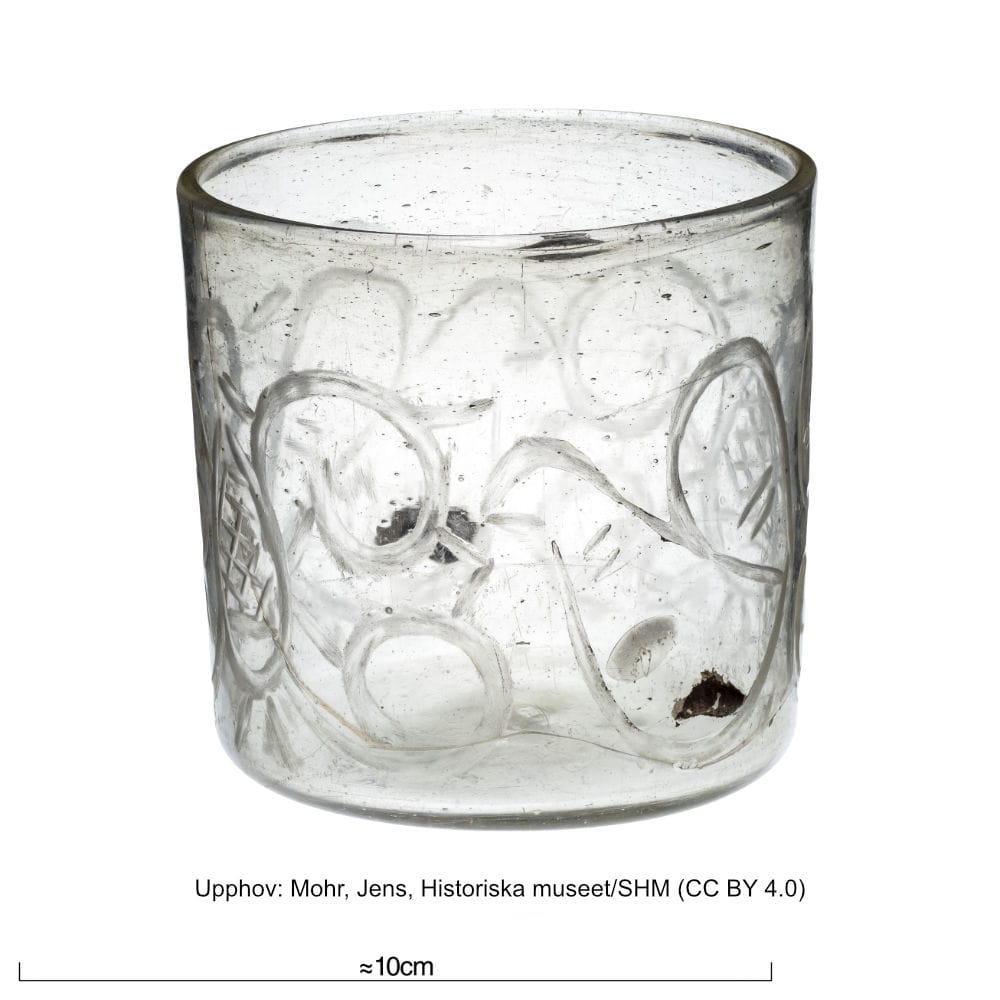 Cylinderformad bägare tillverkad av tjockt, ofärgat glas. Bägaren har en volym på ca 40 cl. Dess slipade dekor pryds av granatäpplen, pinjekottar, fåglar och ett så kallat livsträd. Denna bägare är det enda kända intakta fyndet från ett islamiskt område som upptäckts i Skandinavien. Den tros ha tillverkats i nuvarande Iran eller Irak under 800-talet. Fyndet kommer från en grav i Birka (Bj 542), Adelsö socken, Uppland.