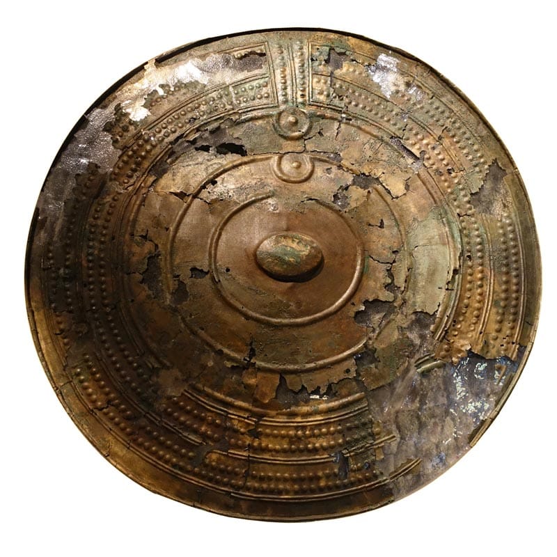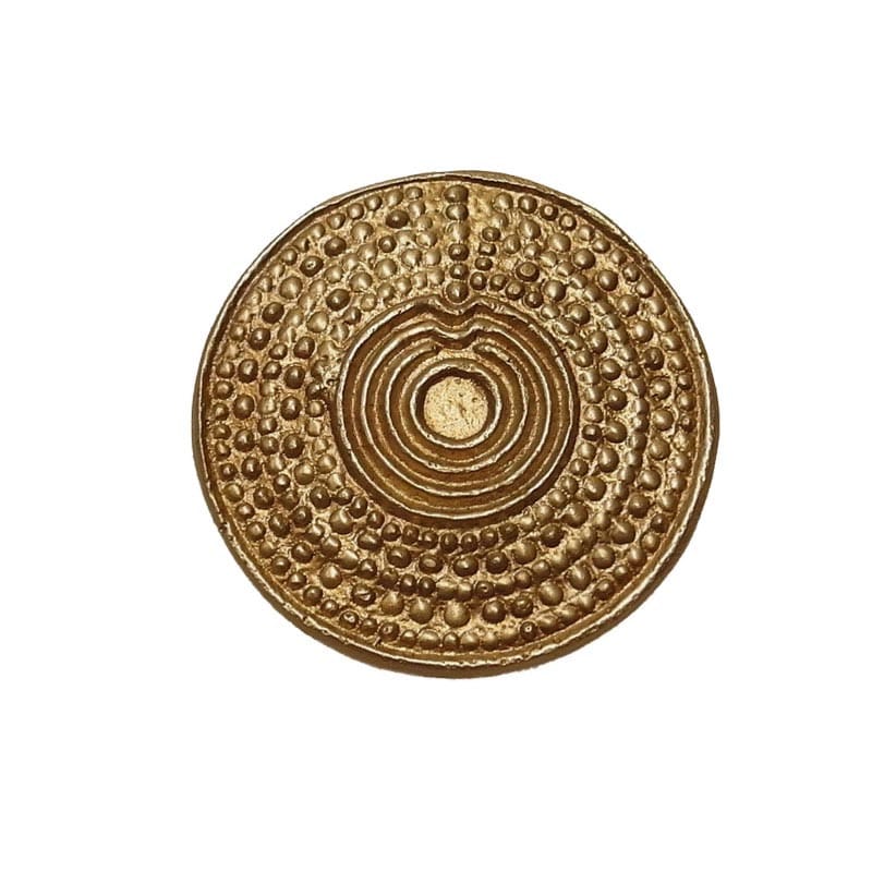 Sköldamulett inspirerad från Fröslundasköldarna, Västergötlands Museum, Skara. Tillverkad av mässing med diametern 4 cm.