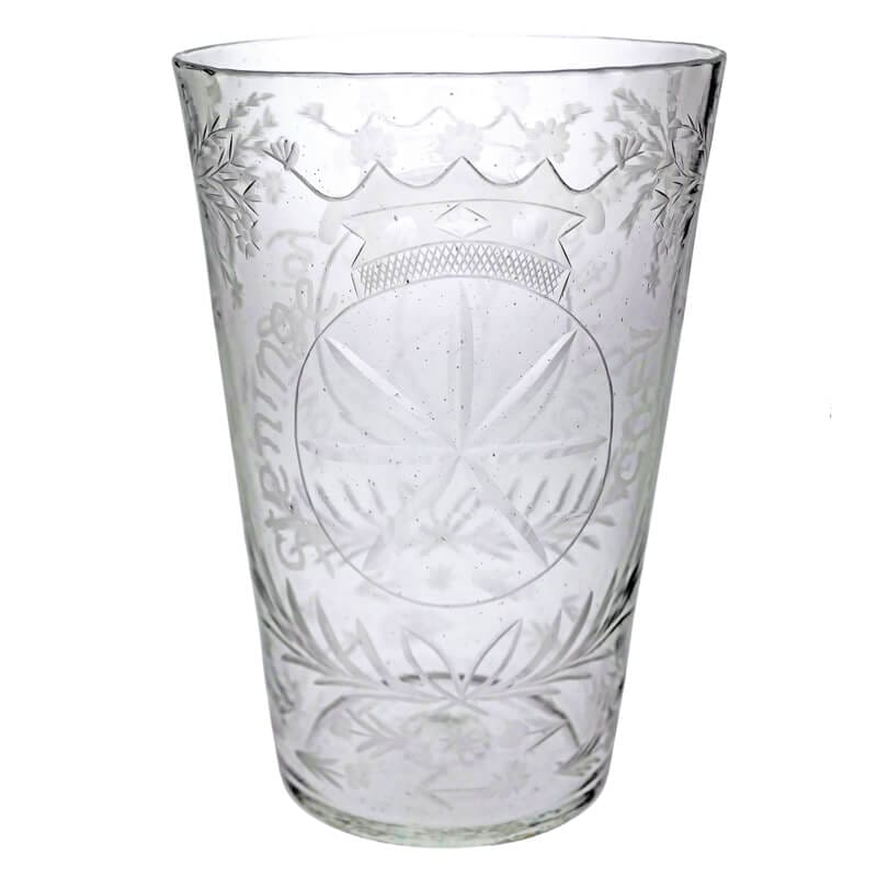 Vas med gravyr, från Steninge 1705. Höjd på ungefär 19 cm.
