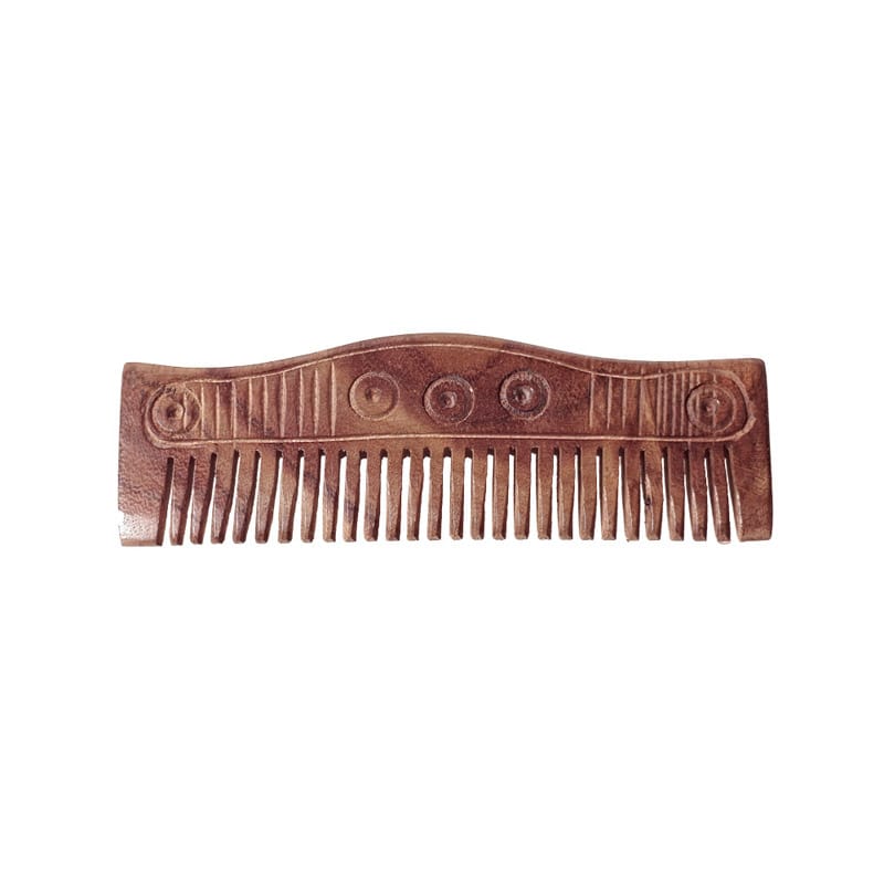 Vikingakam med kurvig rygg tillverkad av trä efter modell från vikingatiden. Kammen har en längd på ca. 120 mm.